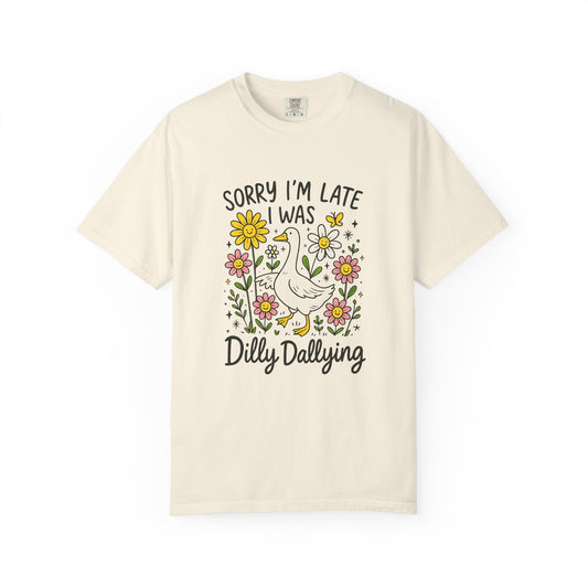 Sorry I'm late I was dilly dallying Funny goose Unisex Garment-Dyed T-Shirt - Casual Vintage Style for Everyday Wear