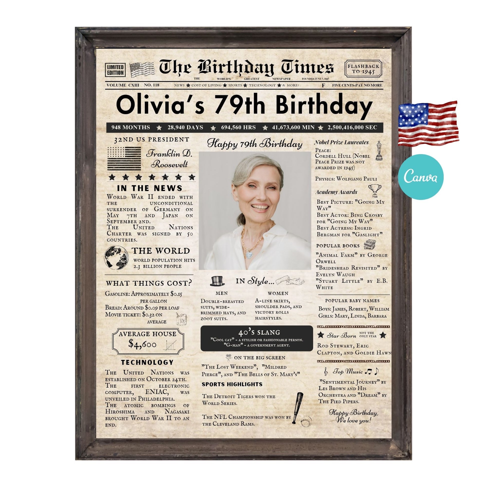 Transform any special occasion into an extraordinary celebration with our Birthday Newspaper Template, available on Canva. Personalized Newspaper Birthday gift (US version) - A digital birthday poster with news, events and highlights from the past, finished as a REALISTIC, AGED, Colored newspaper.