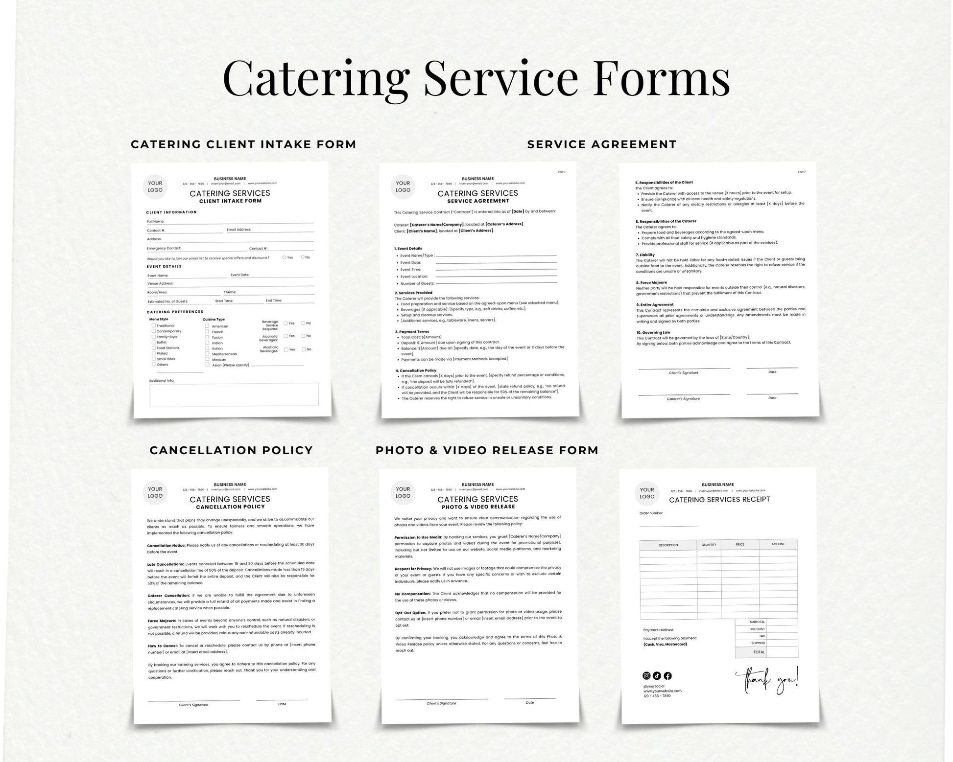 Catering Services Contract Template, Business Card, Event/Wedding Catering Agreement, Catering Order Form, Menu Template, Client Intake Form, Invoice Template – Customizable in Canva