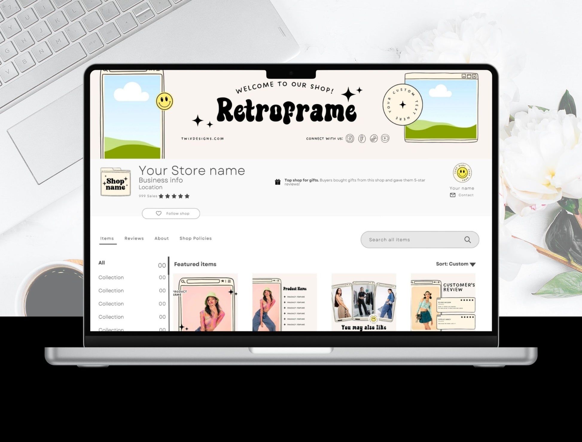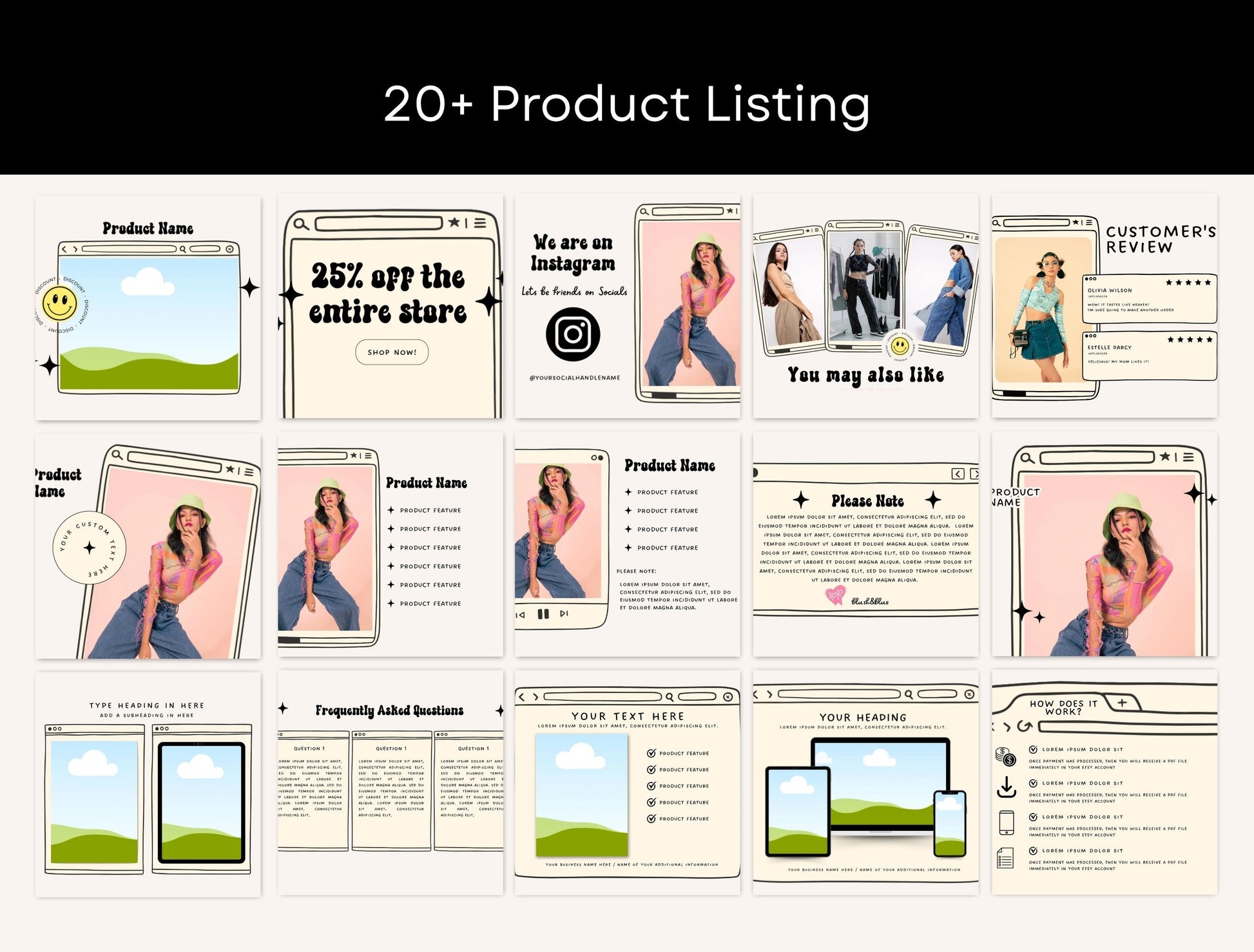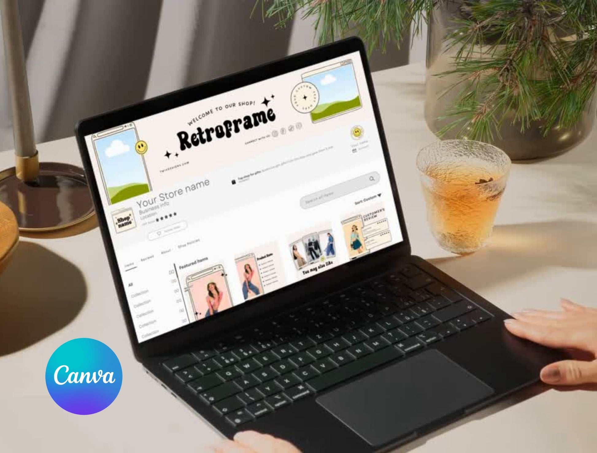 Etsy Shop Kit Retroframe Bundle, Editable Canva Templates, Product Listing Photos Mockup, Etsy Seller Retro Drawn Store Branding