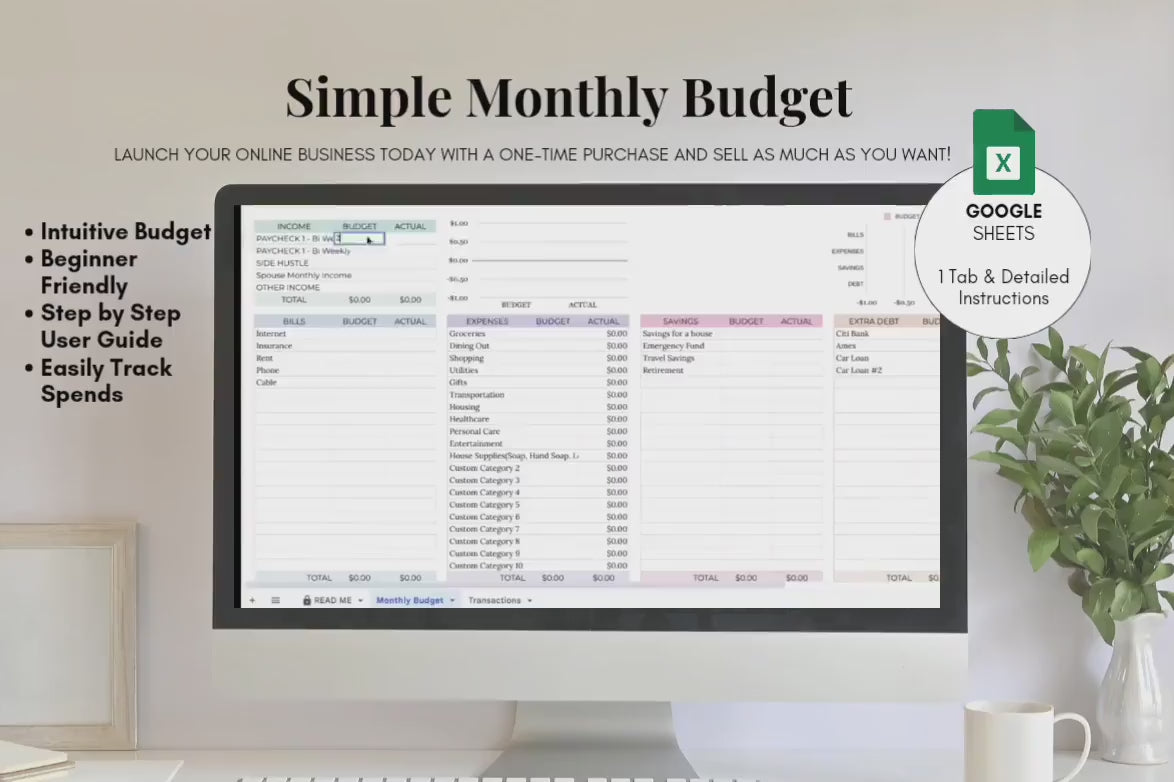 Take control of your finances with our simplest budget planner for Google Sheets! Perfect for beginners, this easy-to-use 1-tab budget is designed to help you start budgeting in just 3 easy steps. Whether you prefer to budget by paycheck, monthly, weekly, or biweekly, this versatile template lets you manage it all!