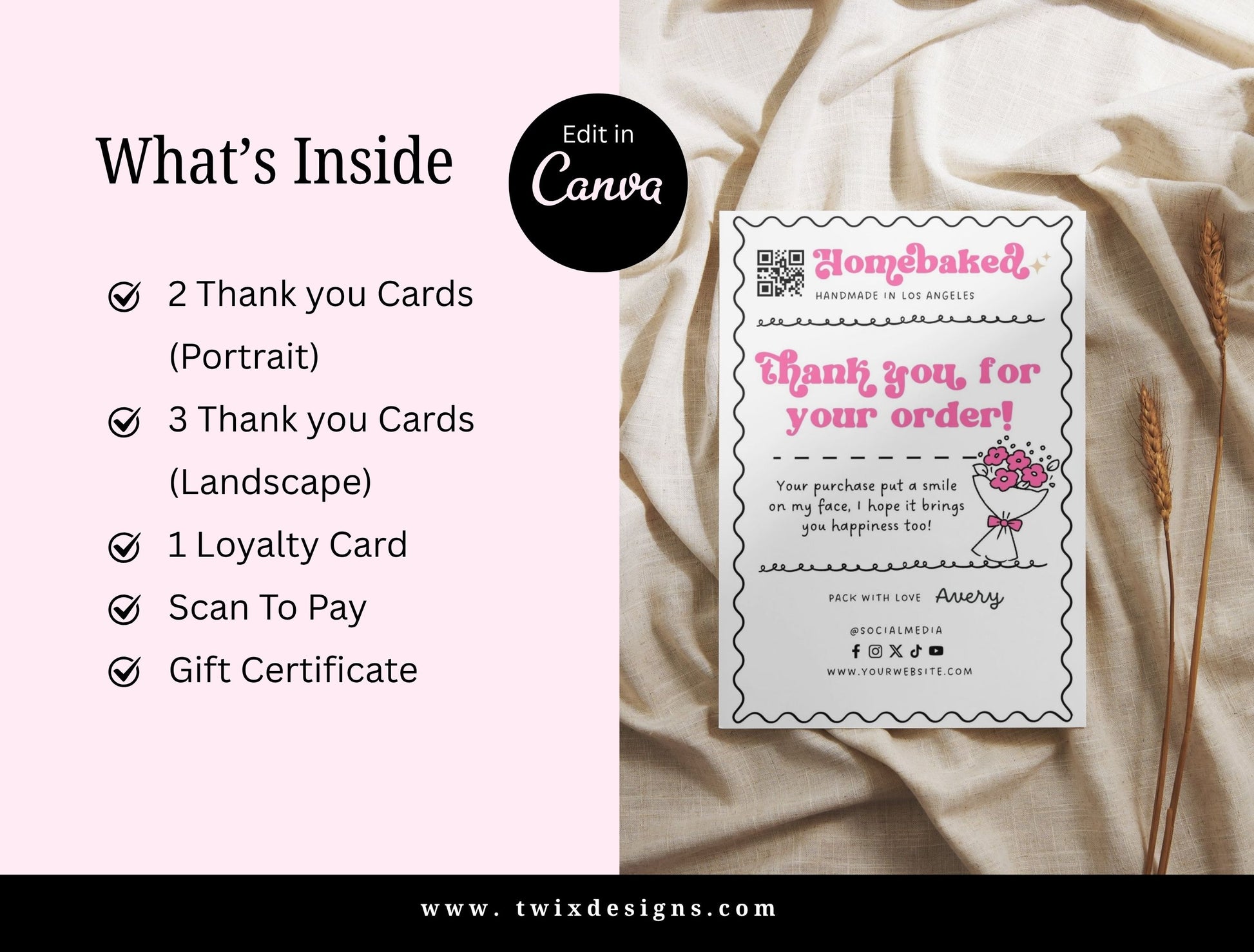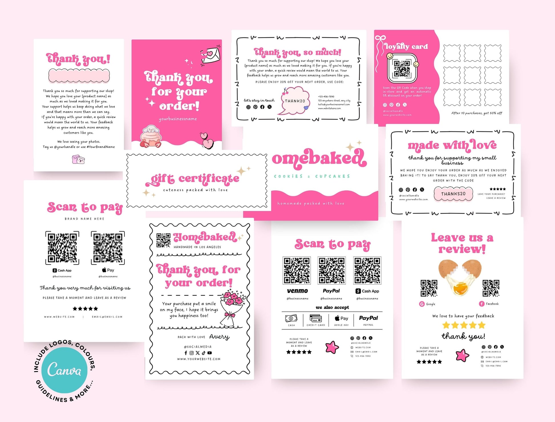 Small Business Printable Kit Canva Templates – Thank You Card, Loyalty Card, Gift Certificate, QR Code Payment Homebaked Bakery Pink Cafe Theme
