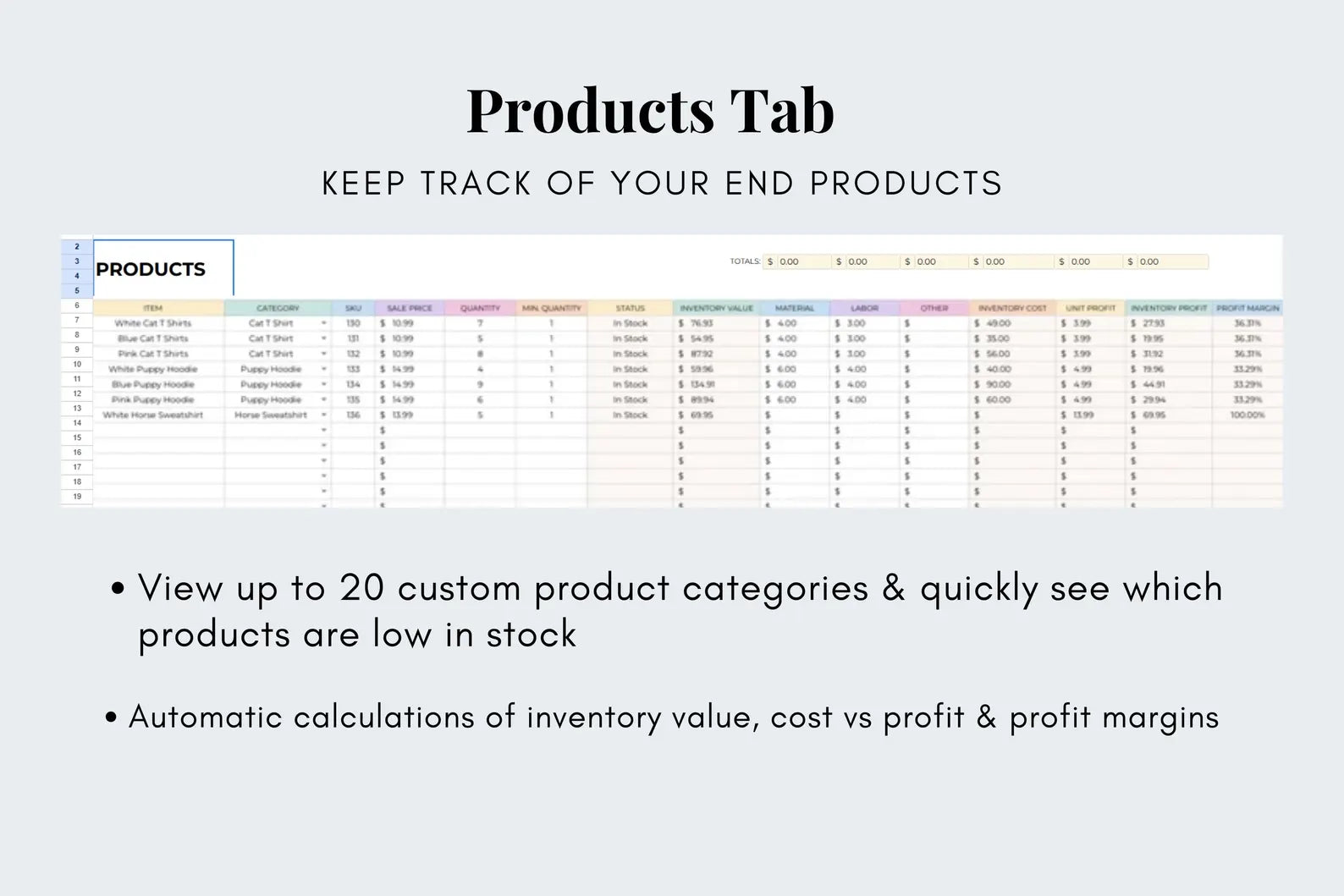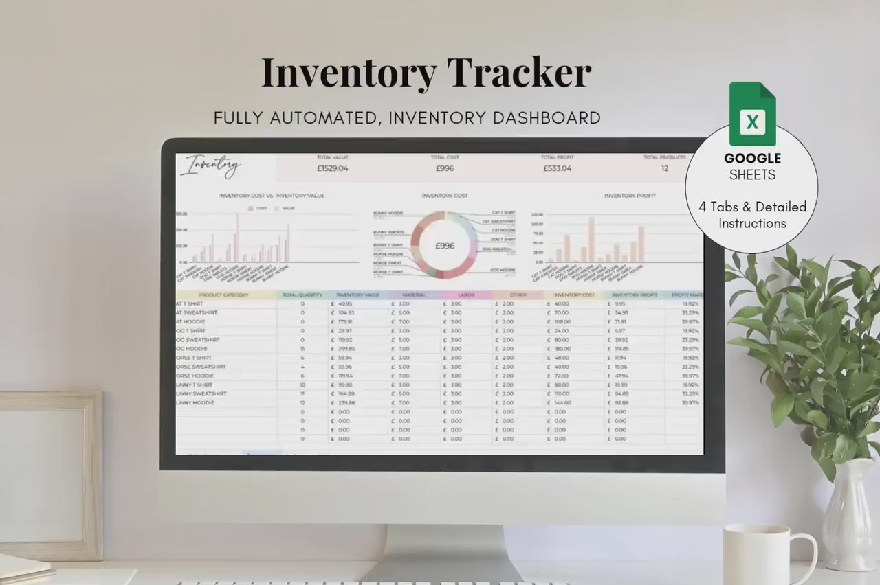 Effortlessly track your inventory and get visual insights into your business’s performance. The spreadsheet is perfect for managing stock, calculating product costs, and visualizing profits, all in one place.